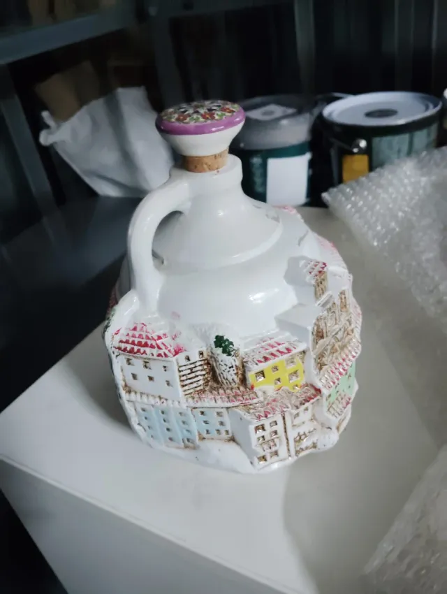 Detalles del productoBotella o licorera de cerámica con un diseño detallado de casas y tejados. El tapón tiene un acabado decorativo.