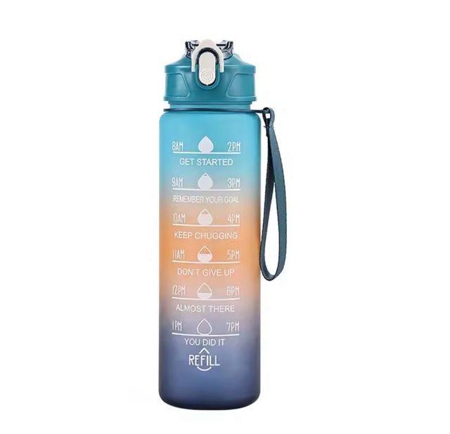 Detalles del productoBotella de agua deportiva con diseño degradado y marcas horarias para ayudarte a mantenerte hidratado.