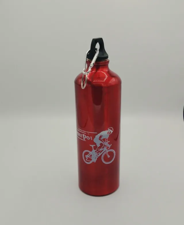 Botella de agua de aluminio roja con diseño de ciclista. - Color rojo brillante. - Incluye mosquetón para colgar. - Diseño deportivo de ciclista.