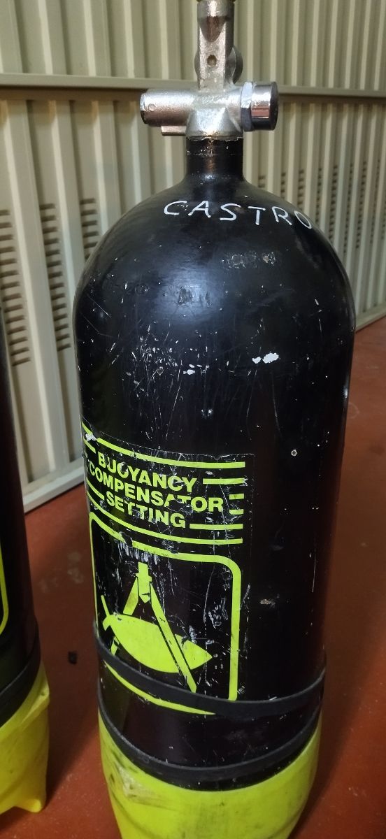 Una botella de buceo de 18 litros con etiqueta Buoyancy Compensator Setting. - Marca: Technisub. - Color: Negro con detalles en amarillo. Hay que hacer el contraste