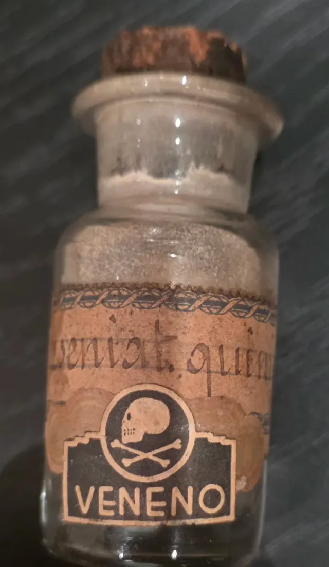 Botella antigua con etiqueta de Veneno. - Etiqueta con símbolo de calavera y tibias cruzadas. - Texto Veneno en la etiqueta inferior. - Tapa de corcho.