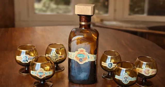 Detalles del productoConjunto de botella de licor y seis copas de coñac con un diseño vintage.