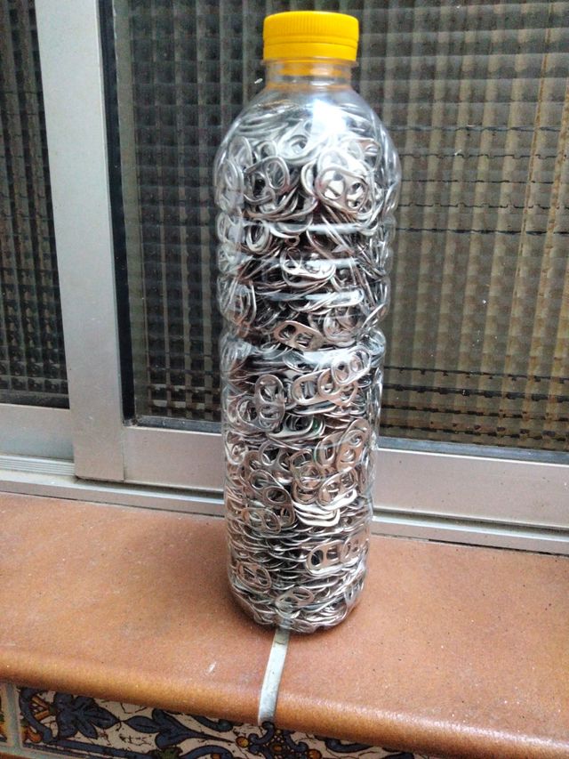 Detalles del productoBotella, llena con chapas o anillas de latas de refrescos redondas, como se ve en las imágenes. La botella es de la capacidad de 1.5l. Todas las chapas son redondas. Estas chapas son idóneas para hacer crochet, manualidades...