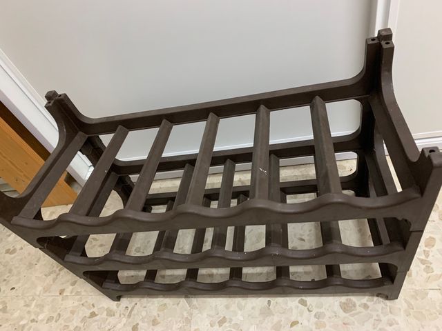 Botellero apilable para seis botellas de plástico color marrón. Un filo está roto pero no afecta a su estabilidad