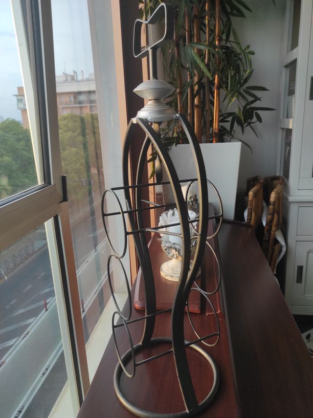 Detalles del productoBotellero con forma de sacacorchos, ideal para los amantes del vino. Es una pieza única y decorativa. Capacidad para tres botellas. De metal, color negro y plateado