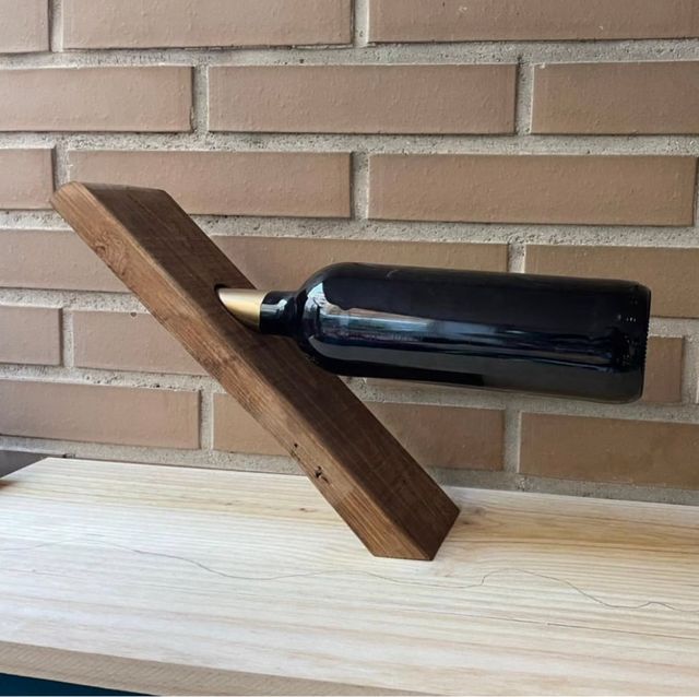 Hecho con madera de pino, tiene una inclinación especial que hace que se sostenga por sí mismo. La botella no se cae, y cuando te la acabas puedes guardarlo sin que ocupe espacio!