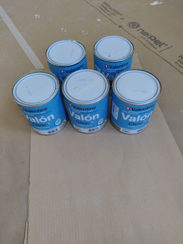 Detalles del productoBotes de pintura marca Valon Clean superlavable de buena calidad de 1 kg cada uno. Disponibles diversos tonos de amarillo, tostado y gris claro, solo se gastaron unos ml para hacer pruebas de color en pared. Adjunto fotos de los tonos y de la muestra en la pared. Cada bote costó casi 12 euros. Los dejo a 4 euros el bote por si a alguien le sirve. Tonos 04a3, 05a3, 06a3, 06n2, 13a2. Dispuesta a negociar si se cogen varios botes.