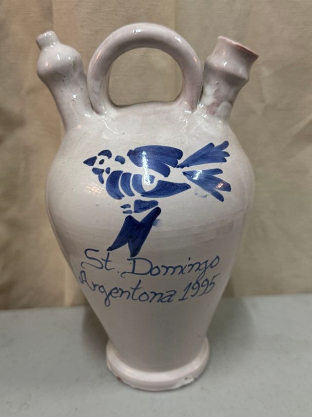 Botijo de cerámica pintado a mano con un diseño de pájaro azul. - Decorado con St. Domingo Argentona 1995. - Asa y dos picos característicos.