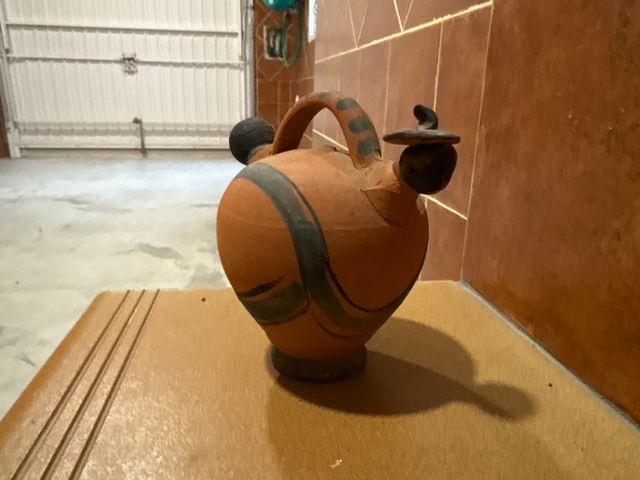 Detalles del productoBotijo de barro decorativo, fabricado en 1994. Presenta un diseño tradicional con bandas en color negro y detalles en relieve.
