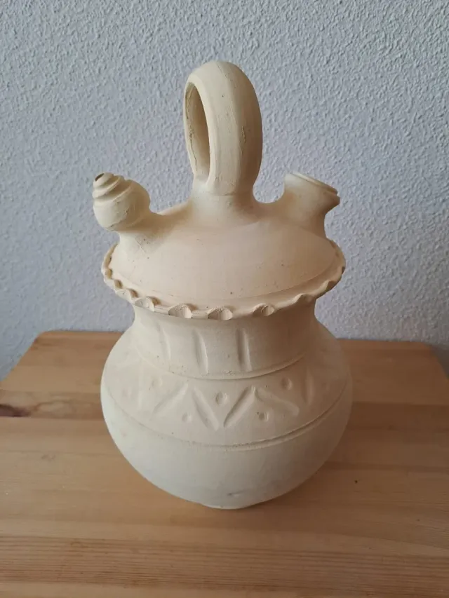 Detalles del productoBotijo de barro artesanal con un diseño tradicional. Ideal para mantener el agua fresca.