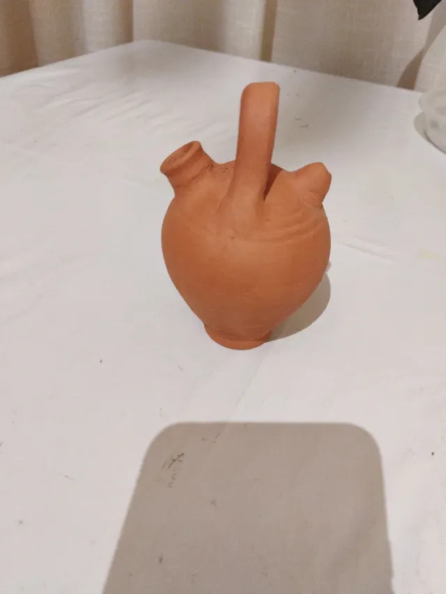 Botijo tradicional de barro. - Material: Barro cocido. - Diseño rústico. - Un asa y dos pitorros. -Medidas: 13 cm de alto.