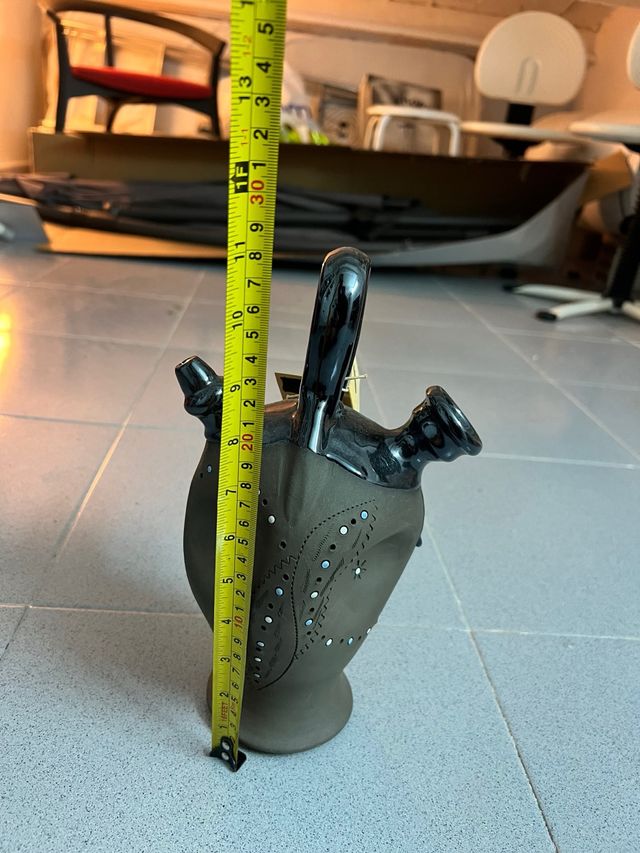 Botijo de cerámica hecho a mano con un diseño único. - Material: Cerámica. - Color: Marrón con detalles brillantes. - Decoración: Motivos perforados y pintados.