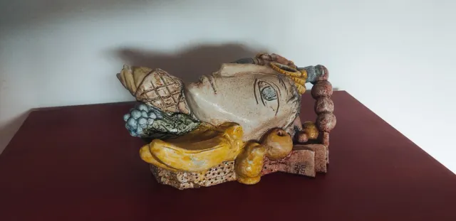Detalles del productoBotijo de cerámica artesanal con un diseño único que representa una cabeza y frutas.