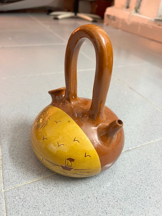Botijo de cerámica artesanal con un diseño único. - Color marrón y amarillo. - Decoración de paisaje marino con barco y pájaros. - Asa curva. - Dos picos.