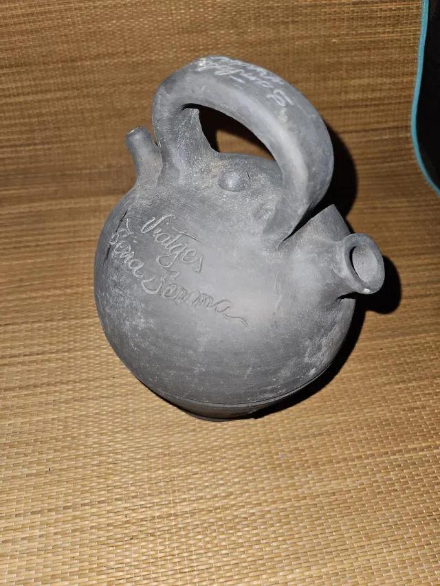 Botijo de cerámica artesanal con inscripciones. - Color gris oscuro. - Diseño tradicional. - Inscripciones Vialges y Sena Sorma.