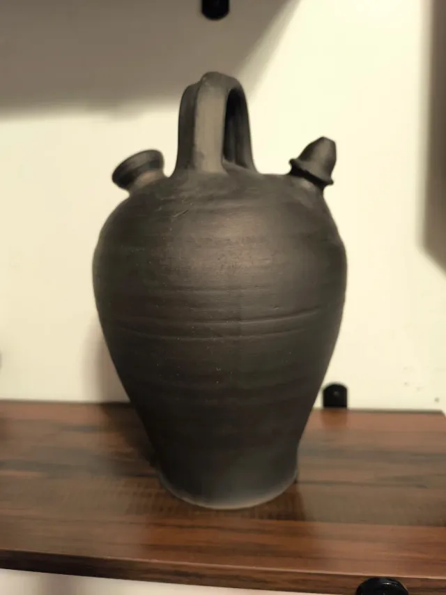 Botijo tradicional de cerámica en color negro. - Material: Cerámica. - Color: Negro. - Diseño: Asa y dos picos.