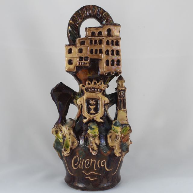 Detalles del productoEstupendo BOTIJO de Coleccion en Ceramica con Imagenes de CUENCA, en el botijo podemos encontrar las casas colgadas de la ciudad, justo debajo de ellas el Caliz y la estrella simbolos de la ciudad.
