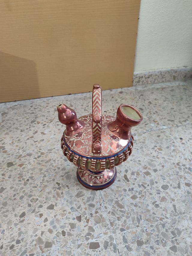 Detalles del productoBotijo de cerámica artesanal de Gimeno Ríos, Manises. Una pieza decorativa con un diseño único.