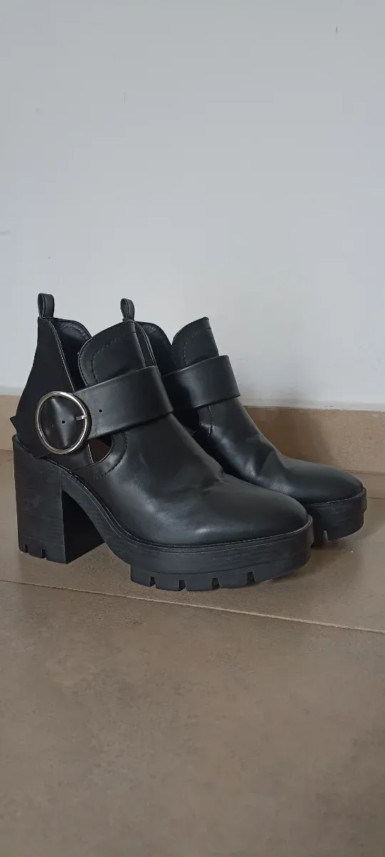 Botines de estilo biker con tacón grueso y detalle de hebilla.