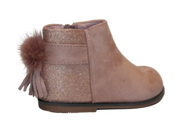 Detalles del productoBotines de antelina en color rosa, talla 22. Tienen un detalle de purpurina en la parte trasera y un pompón con flecos.