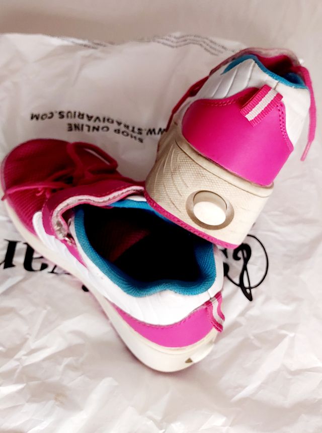 Detalles del productoBotines con ruedines, ideales para niñas. Son de color rosa y blanco, con detalles en azul turquesa. Se encuentran en buen estado.