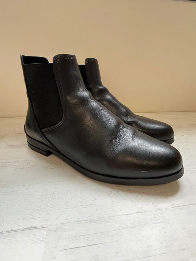 Botines de cuero negro, estilo Chelsea. - Material exterior: cuero. - Diseño elástico lateral. - Suela plana.