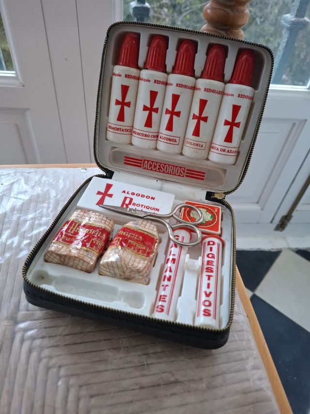 - Contiene varios frascos con etiquetas como HEMOSTATICO, MERCURO CROMO, ALCOHOL, COLONIA y AGUA DE AZAHAR.