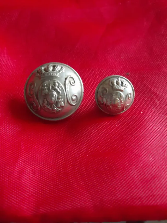 Dos botones metálicos con diseño de corona y escudo. - Botón grande. - Botón pequeño. PRECIO POR EL PACK