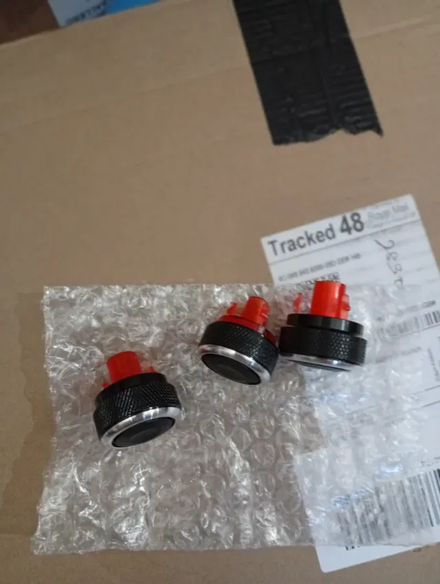 Detalles del productoSet de tres botones para el control del aire acondicionado y la calefacción. Son de color negro con detalles plateados y la parte superior es roja.