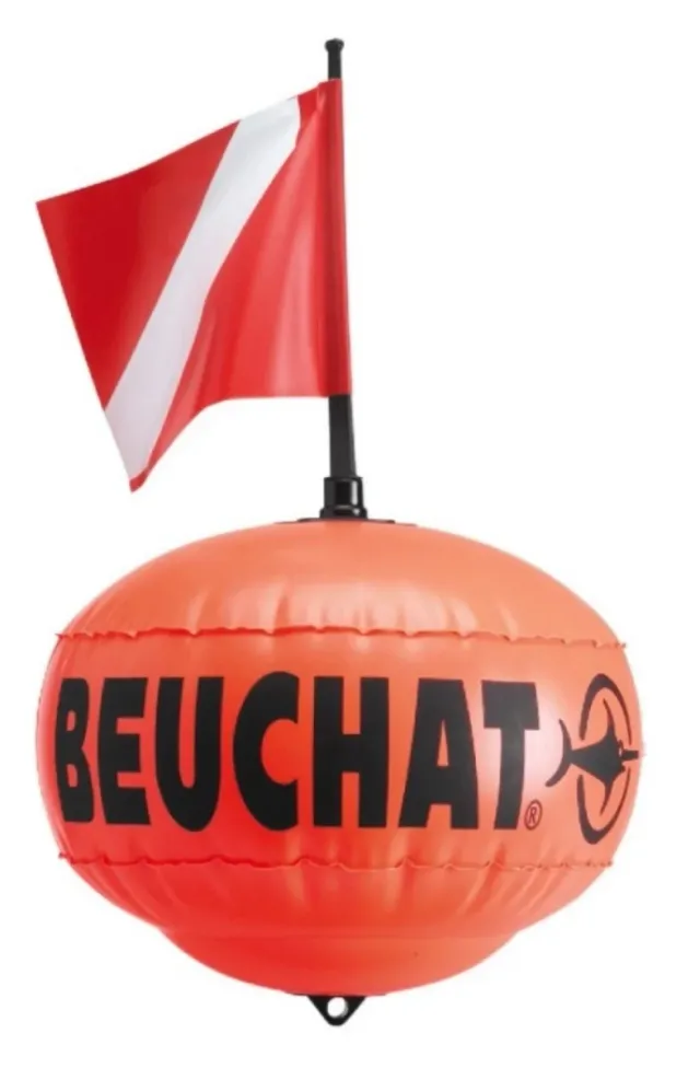 Detalles del productoBoya redonda de señalización para pesca submarina de la marca Beuchat. Es de color naranja brillante y viene con una bandera de buceo roja y blanca.