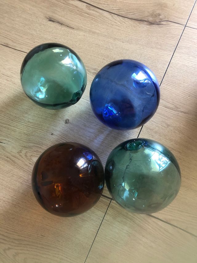 Detalles del productoLas boyas se usaron extensamente hasta los años 50, especialmente por pescadores noruegos y japoneses, antes de ser reemplasadas por materiales como corcho, el aluminio y el plastico. Hoy en dia, las boyas de vidrio son objetos de coleccion y decoracion nautica, apreciadas por su historia y su estetica vintage. Precio unidad 45€. Medidas del producto