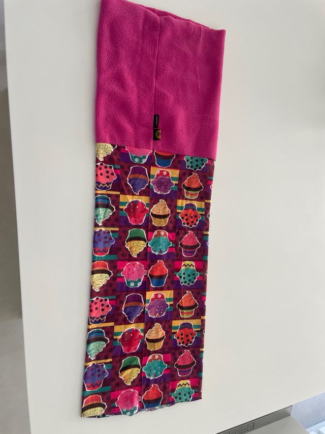 Detalles del productoBraga de cuello original Buff con tecnologia Polartec para deportes de montaña o nieve. Talla niños. Forro polar rosa fucsia y tela multicolor con estampado de tartas . esta como nueva .