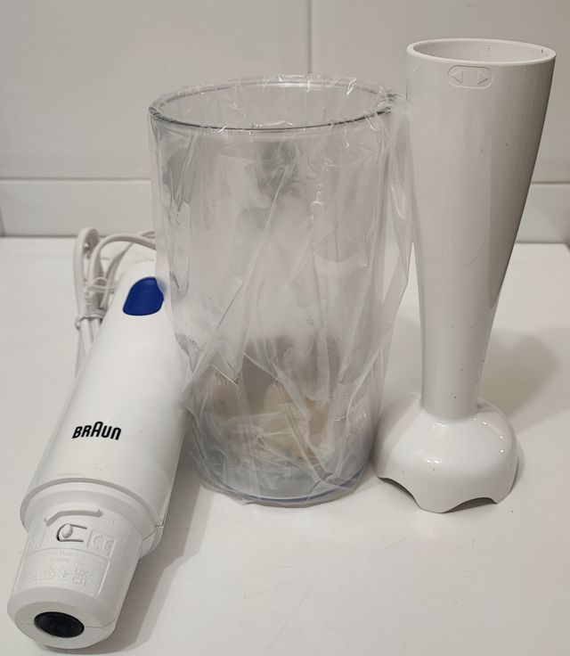 Detalles del productoBraun - Batidora de mano MultiQuick 1, 450w, blanco. Incluye vaso. El potente motor de 450 W y las cuchillas de acero inoxidable garantizan un resultado suave sin esfuerzo. Es fácil controlar la velocidad con una mano y el peso ligero del dispositivo aumenta la comodidad de uso. El cabezal mezclador se puede lavar en el lavavajillas después de su uso. En perfecto estado. No ha sido usada.