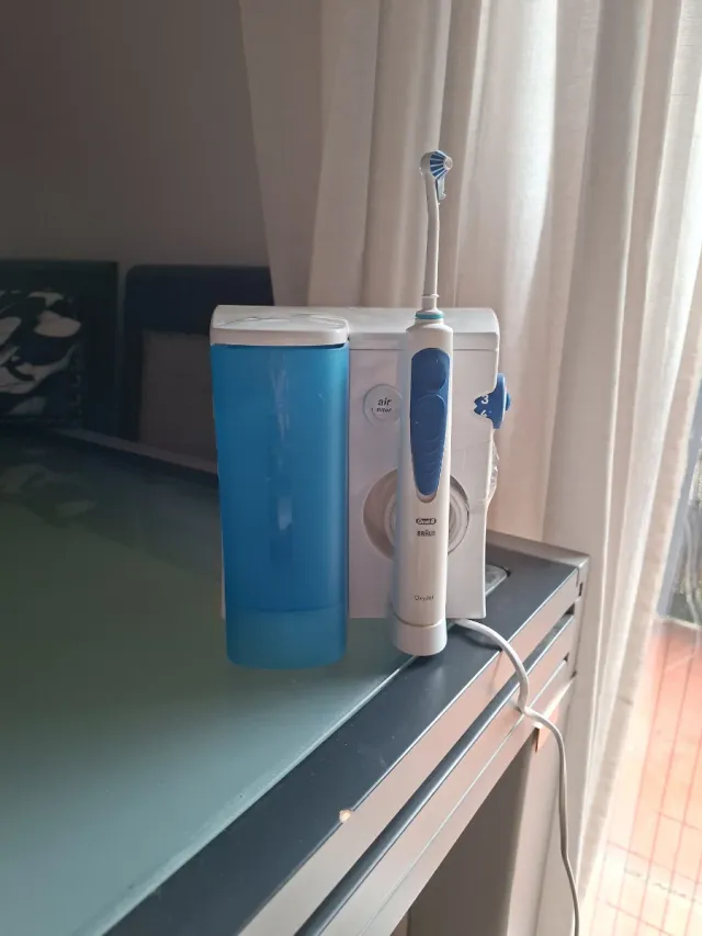 Detalles del productoIrrigador dental Braun Oral-b OxyJet con tecnología OxyJet. Incluye un depósito azul para el agua.