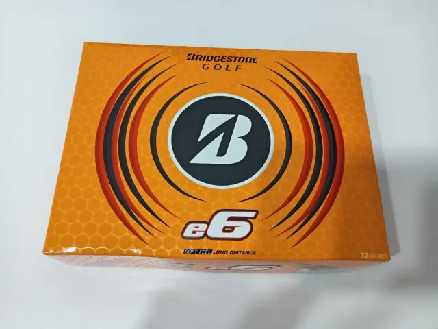 Caja de 12 bolas de golf Bridgestone e6. - Diseño con patrón de panal naranja. - Logotipo de Bridgestone Golf. - Modelo e6 con texto Soft Feel Long Distance.