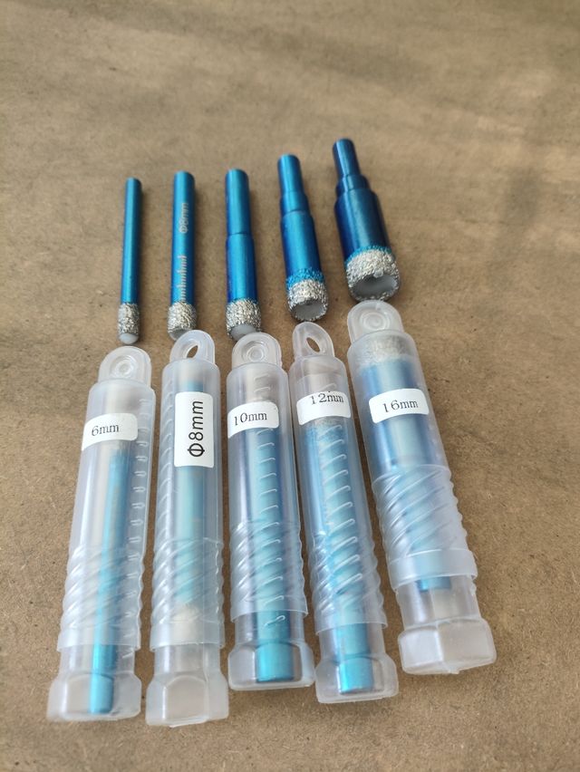 - Brocas de diferentes diámetros: 6mm, 8mm, 10mm, 12mm, 16mm, para usar en taladro o atornillador. Coronas de 60mm para enganche en métrica 14. Ideal para radial.