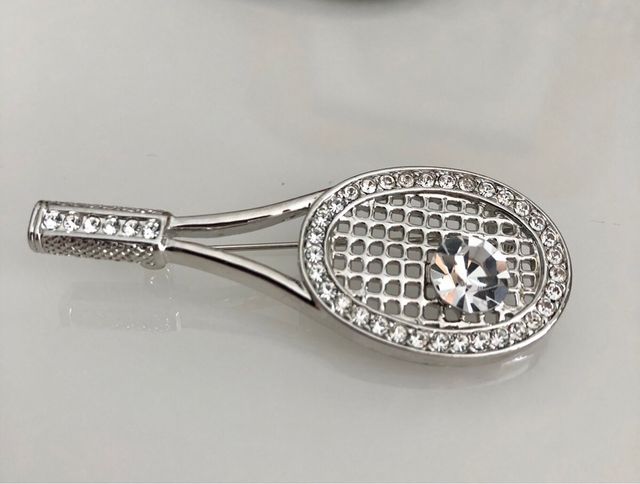 Detalles del producto Broche de metal plateado con incrustaciones de cristal, forma de raqueta.