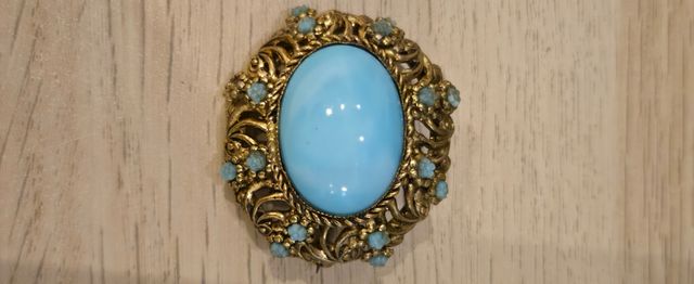 Este elegante broche vintage data de los años 50. Se vende como está. Presenta un diseño ovalado con una piedra central de color azul y un marco metálico dorado.