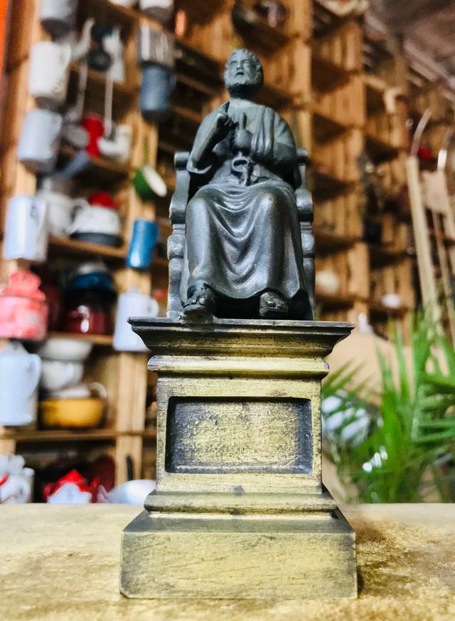 De bronce patinado sentado en un trono, sostiene la llave del cielo.