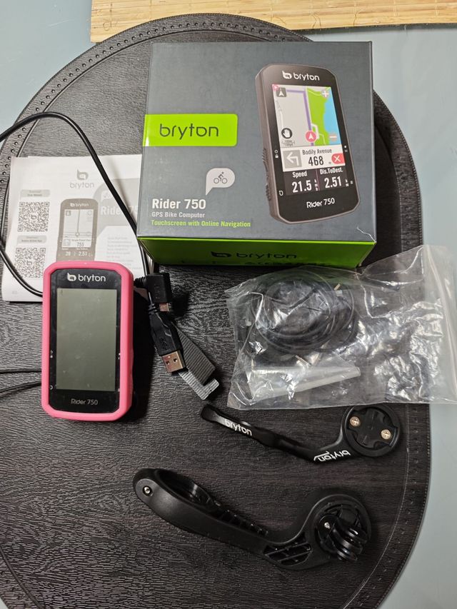 Detalles del productoCiclocomputador GPS Bryton Rider 750 con pantalla táctil y navegación online. Incluye el dispositivo, caja original, manual, cable USB y soportes.