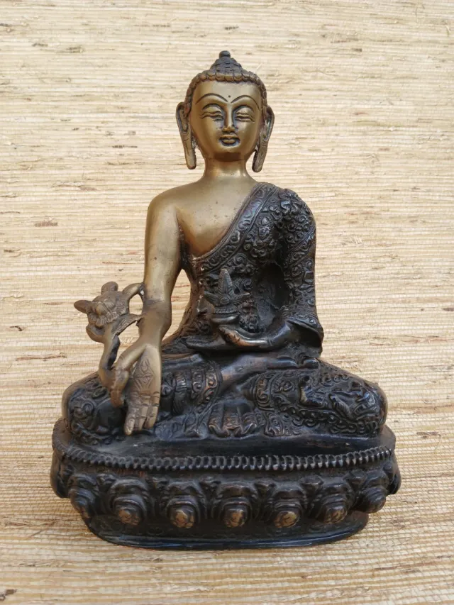 Figura de Buda en bronce, originaria de India. Una pieza decorativa con gran detalle. - Altura: 22 cm. - Peso: 2.45 Kg.