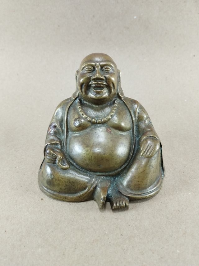 Detalles del productoPreciosa escultura de Buda sonriente o buda feliz de laton, de fabricación artesanal India datado de principios de siglo XX. Con su pegatina de importación original. La figura posee una preciosa pátina original. Mide 8'8cm. Pesa 370.7 gramos