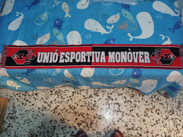 Bufanda de la Unió Esportiva Monòver. - Diseño con los colores rojo y negro. - Logo del club. - Flecos en los extremos.