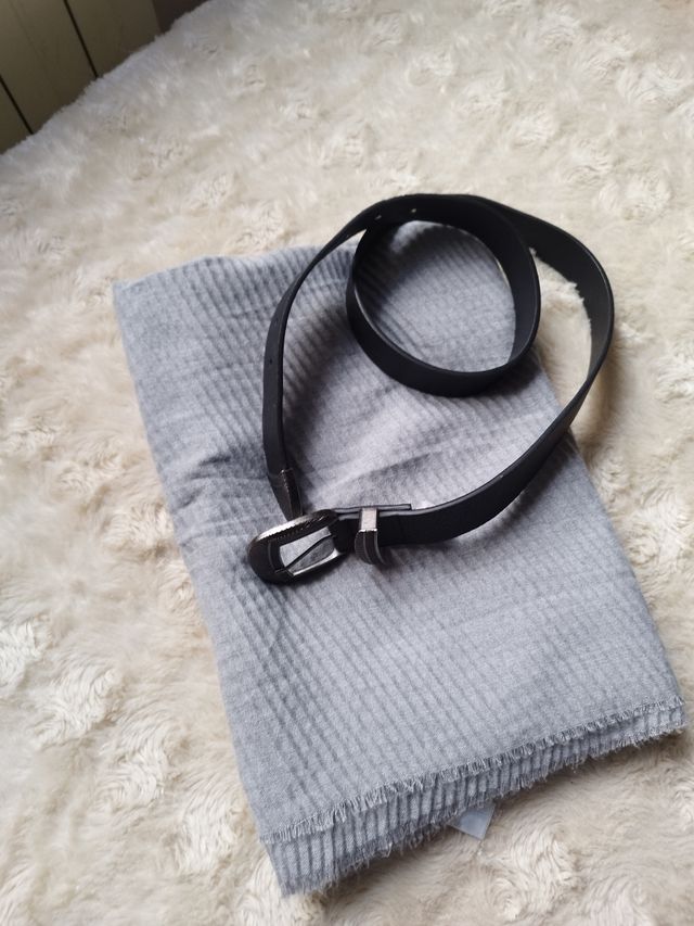 Bufanda gris y cinturón negro