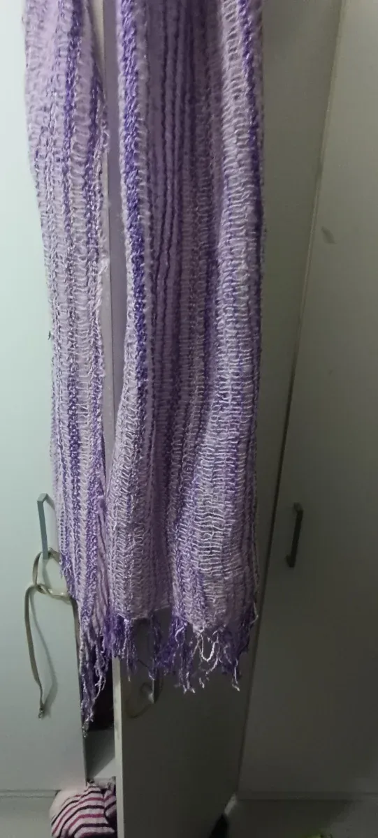 Bufanda morada y blanca con flecos