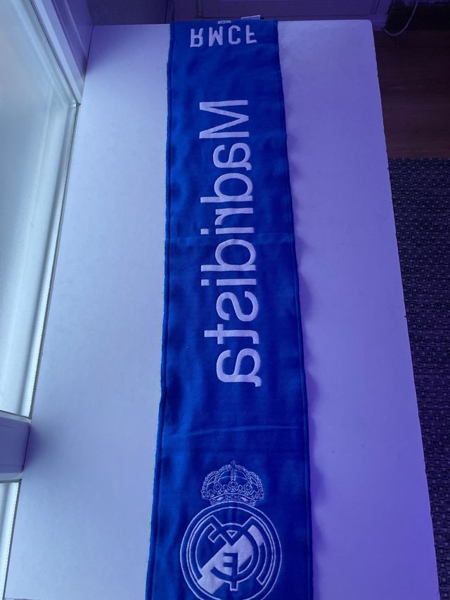 Bufanda del Real Madrid con el escudo del club. - Color azul. - Diseño con 'Madridistas'.