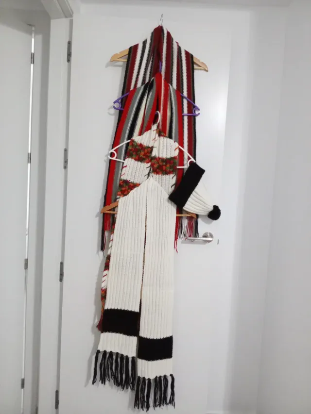 - Bufanda de rayas rojas, negras, grises y blancas.