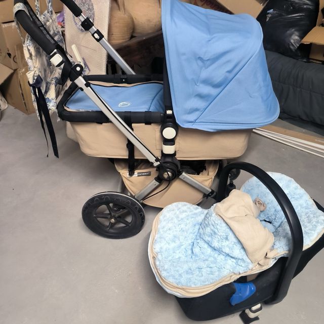 Detalles del productoConjunto Bugaboo Camaleon 3 en color beige y azul, incluye silla de paseo y maxicosi.