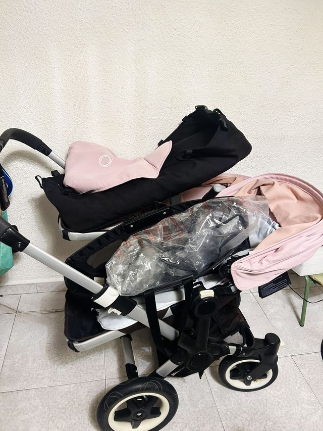Carrito Bugaboo Donkey en color rosa y negro. - Chasis plateado. - Capazo y silla. - Incluye plástico de lluvia -incluye accesorios.