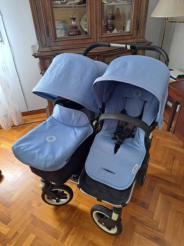 Detalles del productoSilla de paseo gemelar Bugaboo Donkey 2 en color azul. Perfecta para hermanos con poca diferencia de edad o gemelos.